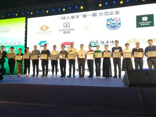 九家優(yōu)品企業(yè)代表獲牌(左四開(kāi)始:左右沙發(fā)、雅蘭床墊、松堡王國(guó)、七彩人生、仁豪居品、圓方園、格調(diào)家私、路福寢具、德勝家具)