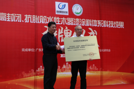 10月21日,廣東海順新材料科技有限公司(以下簡稱:海順科技)高封閉、抗脹筋水性木器漆涂料體系科技成果授牌儀式隆重舉行。中國高科技產(chǎn)業(yè)化研究會副主任兼秘書長李浩、佛山市順德區(qū)經(jīng)濟與科技促進局副局長楊艷生、順德涂料商會會長胡景釗出席本次活動并發(fā)言,巴斯夫、立邦、華潤涂料、美涂士等20多家知名涂料企業(yè)進行了現(xiàn)場互動,與會嘉賓對海順科技水性木漆涂料體系給予了高度評價。