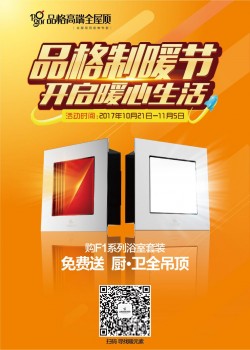 10月21日~11月5日品格制暖節(jié)火熱開啟,搶銳智浴室空調(diào)(銳智5.0) 送一廚一衛(wèi)全吊頂,F(xiàn)1系列浴室套裝,滿5980元送一廚一衛(wèi)全吊頂,還可疊加享受門店砸金蛋活動,100%中獎!