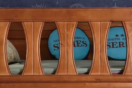 上下鋪就靠4根柱體連接,當(dāng)孩子在床上玩耍的時(shí)候,安全性應(yīng)該被更加重視。上下屏外觀設(shè)計(jì)沒有關(guān)聯(lián),2種不同的款式,若能更好的融合上下屏設(shè)計(jì)會更好。護(hù)欄處的實(shí)木鏤空裝飾應(yīng)當(dāng)是富有趣味性設(shè)計(jì),應(yīng)與青少年愛好有關(guān)聯(lián)。