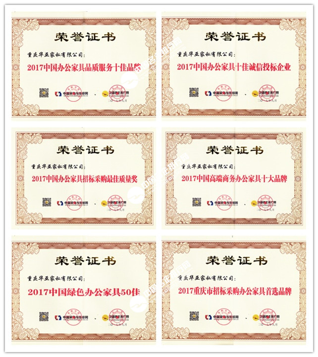 為檢驗公司市場競爭力,為政府機構(gòu)、項目業(yè)主在招投標方面提供更具針對性的服務(wù),華亞家私每年都會參加中國采購與招標網(wǎng)、中國名企排行網(wǎng)聯(lián)合舉辦的辦公家具招標采購評價推介活動。在“2017第九屆中國辦公家具招標采購評價推介活動”中,通過對企業(yè)銷售額、總資產(chǎn)、稅后利潤、中標金額、注冊資金、經(jīng)營年限等10余項數(shù)據(jù)的核對、分析、對比,經(jīng)過專家的綜合評審,最終獲得“中國高端商務(wù)辦公家具十大品牌”、“中國辦公家具十佳誠信投標企業(yè)”、“中國辦公家具品質(zhì)服務(wù)十佳品牌”、“中國綠色辦公家具50佳”、“中國辦公家具招標采購最 佳質(zhì)量獎”、“重慶市招標采購辦公家具首選品牌”。這是華亞家私24年如一日建立起來的成果,以大數(shù)據(jù)為依托的評價,是對華亞家私最公正的評價。