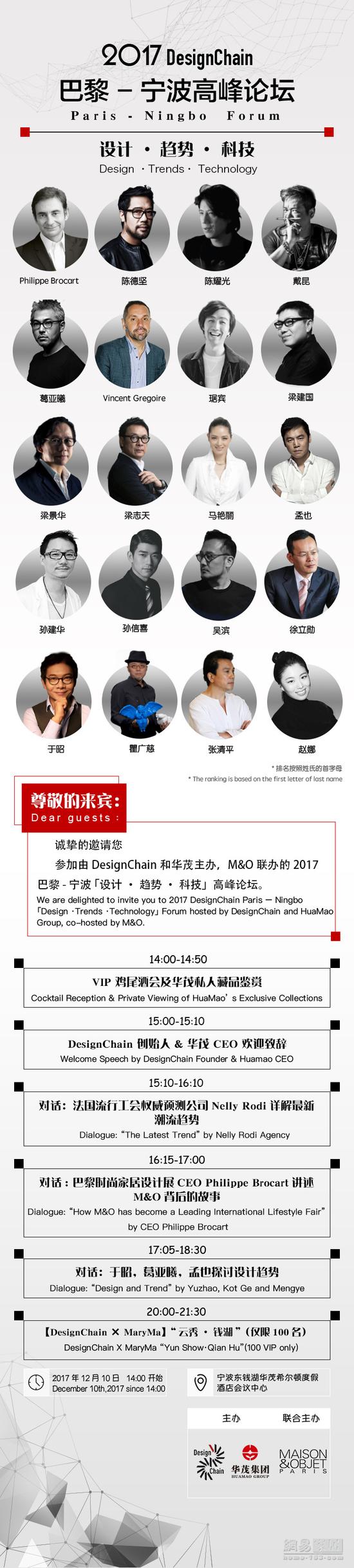 12月10日,國內(nèi)首家專注家居和室內(nèi)設計服務平臺DesignChain將在寧波東錢湖舉辦2017巴黎-寧波「設計·趨勢·科技」高峰論壇。此次論壇由DesignChain和華茂集團主辦,由MAISON & OBJET PARIS巴黎時尚家居設計展(M&O)協(xié)辦,是建筑、家居設計產(chǎn)業(yè)內(nèi)外難得一遇的國際交流盛會。論壇將匯聚海內(nèi)外地產(chǎn)、家居、設計、藝術(shù)、時尚領(lǐng)域極富影響力的資深專業(yè)人士及機構(gòu),旨在聚合當今最優(yōu)秀的設計力量,在DesignChain呈現(xiàn)的跨國籍、跨領(lǐng)域的國際專業(yè)平臺上,共同探索和培育設計創(chuàng)新力,助推行業(yè)生態(tài)的發(fā)展與變革。