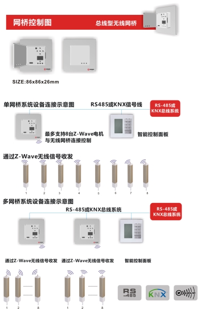 RS-485/KNX轉(zhuǎn)Z-Wave無線網(wǎng)橋,可同時控制8個Z-Wave協(xié)議窗簾電機;網(wǎng)橋連接的8臺電機可獨立設(shè)置ID地址,具備獨立控制、群控功能。外接RS485/KNX總線系統(tǒng),可對電機分組、群控、場景控制,實現(xiàn)智能控制功能。網(wǎng)橋功耗低、抗干擾能力強,可吸頂安裝、墻控8盒安裝,操作靈活簡易。