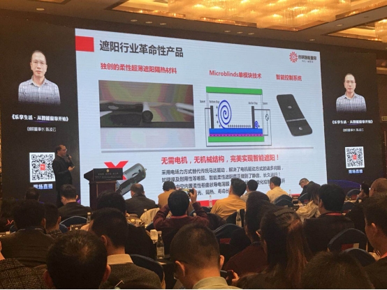 會上,創(chuàng)明推出柔性遮陽產(chǎn)品——調(diào)光玻璃,選用獨創(chuàng)的柔性超薄遮陽隔熱材料 ,應(yīng)用Microblinds單模塊技術(shù),接入智能控制系統(tǒng)后,即可無需電機,無機械結(jié)構(gòu),高效實現(xiàn)隔熱節(jié)能,經(jīng)久耐用的智能遮陽調(diào)光體驗,是遮陽行業(yè)革命性產(chǎn)品。