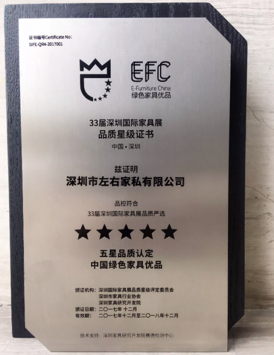 ▲左右沙發(fā)獲得“5星+綠色優(yōu)品”認(rèn)定獎(jiǎng)