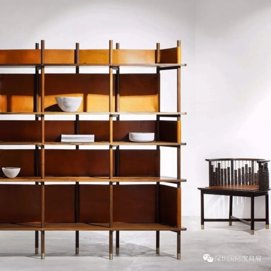 這款博古架叫“魔方”,它的趟板可以滑動(dòng),布置與物品搭配可按主人的口味變化,讓這些布置在空間里挑動(dòng)活潑趣味的效果。而板塊的大小不規(guī)則,很有現(xiàn)代藝術(shù)感。半鏤空的設(shè)計(jì)使整個(gè)架子多了一些輕盈的美感,皮和金屬與木的混搭顛覆了傳統(tǒng)木架的刻板枯燥感。