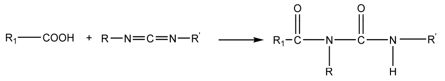 碳化二亞胺可與-COOH反應(yīng)形成交聯(lián),可作為水性涂料的交聯(lián)劑,反應(yīng)式如下。