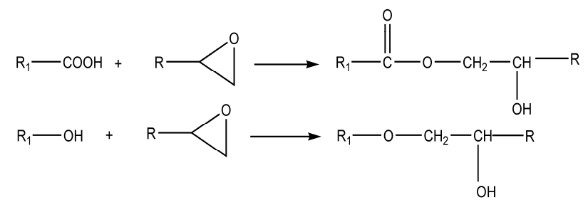 在室溫和中等溫度條件下環(huán)氧基可以和樹脂中的羧基和羥基發(fā)生化學(xué)反應(yīng),其反應(yīng)式如下。這類反應(yīng)也可用于乳液合成中使乳膠粒子輕度交聯(lián)。