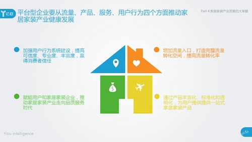 通過分析家居家裝產(chǎn)業(yè)現(xiàn)狀以及消費(fèi)者特征,億歐智庫(kù)認(rèn)為,未來幾年平臺(tái)型家居家裝企業(yè)更容易在競(jìng)爭(zhēng)中勝出,但平臺(tái)型企業(yè)與垂直型企業(yè)不是競(jìng)爭(zhēng)關(guān)系,而是魚水共存關(guān)系。家居家裝平臺(tái)型企業(yè),可以從流量、產(chǎn)品、服務(wù)、用戶行為四個(gè)方面推動(dòng)家居家裝產(chǎn)業(yè)健康發(fā)展。
