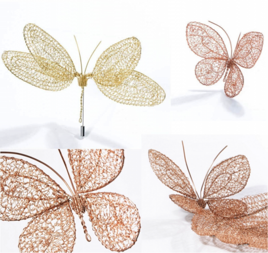 蝴蝶與蜻蜓都是來(lái)自大自然的美麗生靈,是傳遞美好精致生活的信使。這兩種美麗的生靈結(jié)合了金工首飾工藝與繞線首飾的部分工藝來(lái)制作,配合金屬鉤編工藝,使翅膀輕盈精致。大尺寸的蝴蝶與蜻蜓背部裝有小磁鐵片,只需將另一片小磁片黏貼在所裝飾的物體上,再吸住其背部磁片即可固定。這美麗的生靈能停駐于房間任何位置,將大自然清新的氣息帶進(jìn)你的生活。小尺寸的蝴蝶與蜻蜓制作成為胸針,翩翩飛舞化身精致的首飾,停歇于你的胸前、肩頭以及耳畔。
