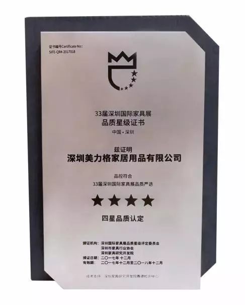 深圳家協(xié)針對即將舉辦的2018國際家具展,首次全面啟動參展商“品質(zhì)星級評定”工作,目的是提升品牌含金量,打造行業(yè)品質(zhì)標桿。美力格以對自身品質(zhì)的高度自信,主動參與評定,經(jīng)過數(shù)月的嚴苛抽檢,美力格以遠超國際標準的過硬實力成功晉級,獲得四星認證榮譽。在授牌儀式上,美力格副總經(jīng)理江春琴女士接過品質(zhì)獎牌,這是對兢兢業(yè)業(yè)在家具行業(yè)耕耘60年的美力格又一次肯定、嘉許以及期望。