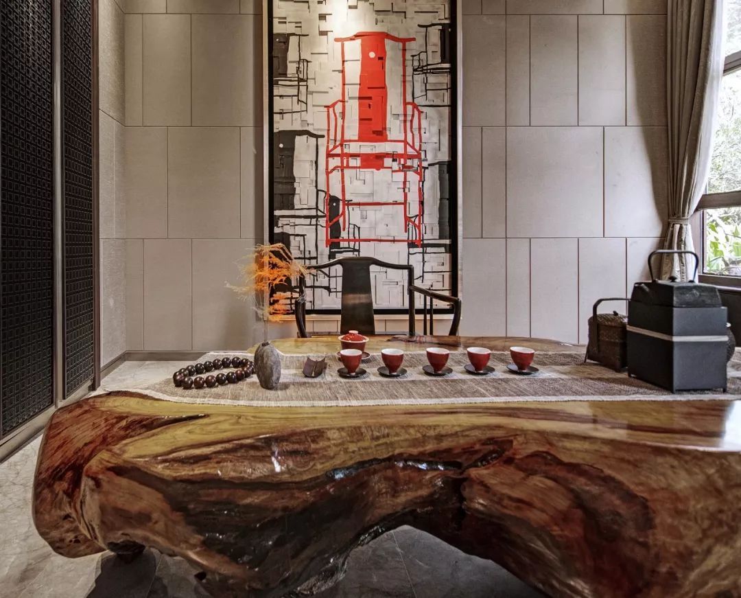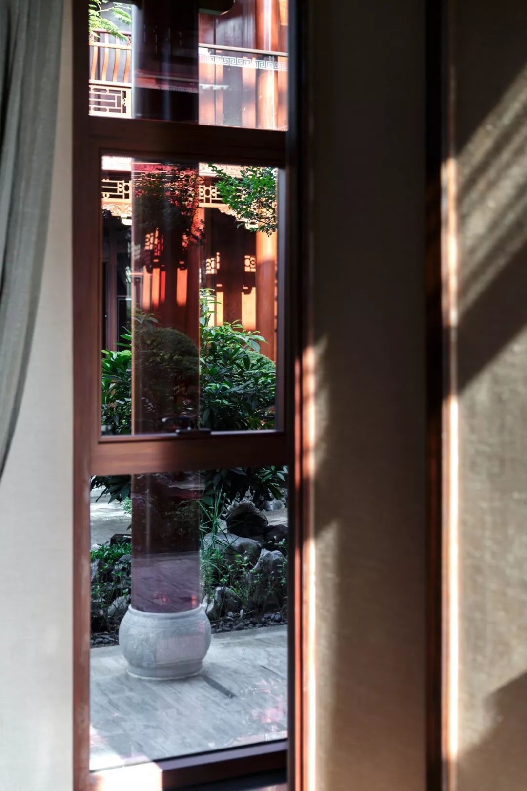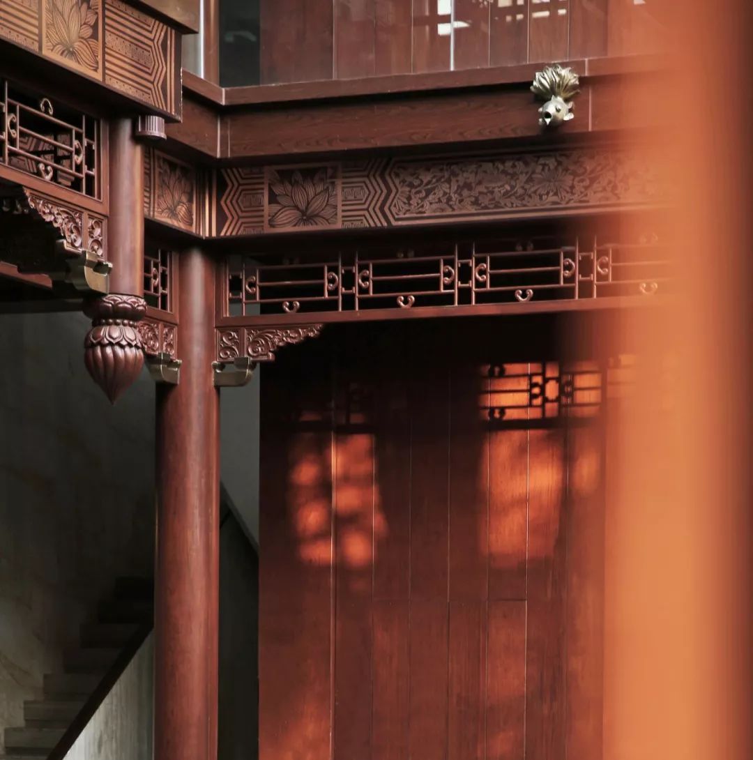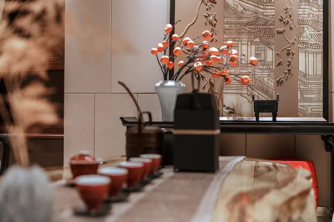 茶道的古韻古香透露著恬淡優(yōu)雅的生活氛圍。脫葉已疏,幾株熟透的柿果壓枝;雕花柔美,更顯木版畫上樓閣的剛勁肅穆,折射出設(shè)計(jì)對(duì)傳統(tǒng)合院式空間意境的追求與傳承。