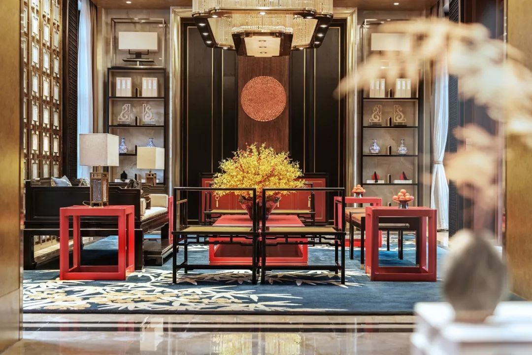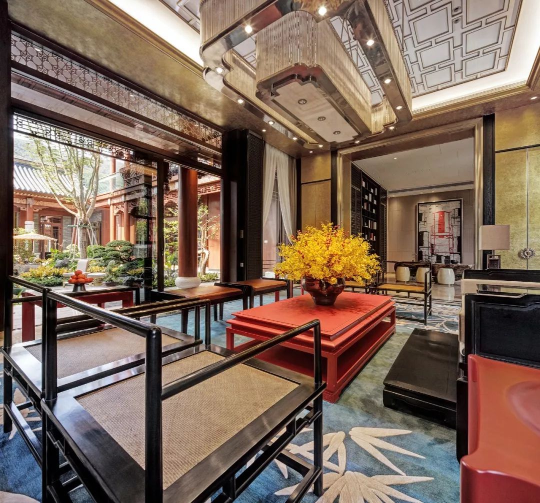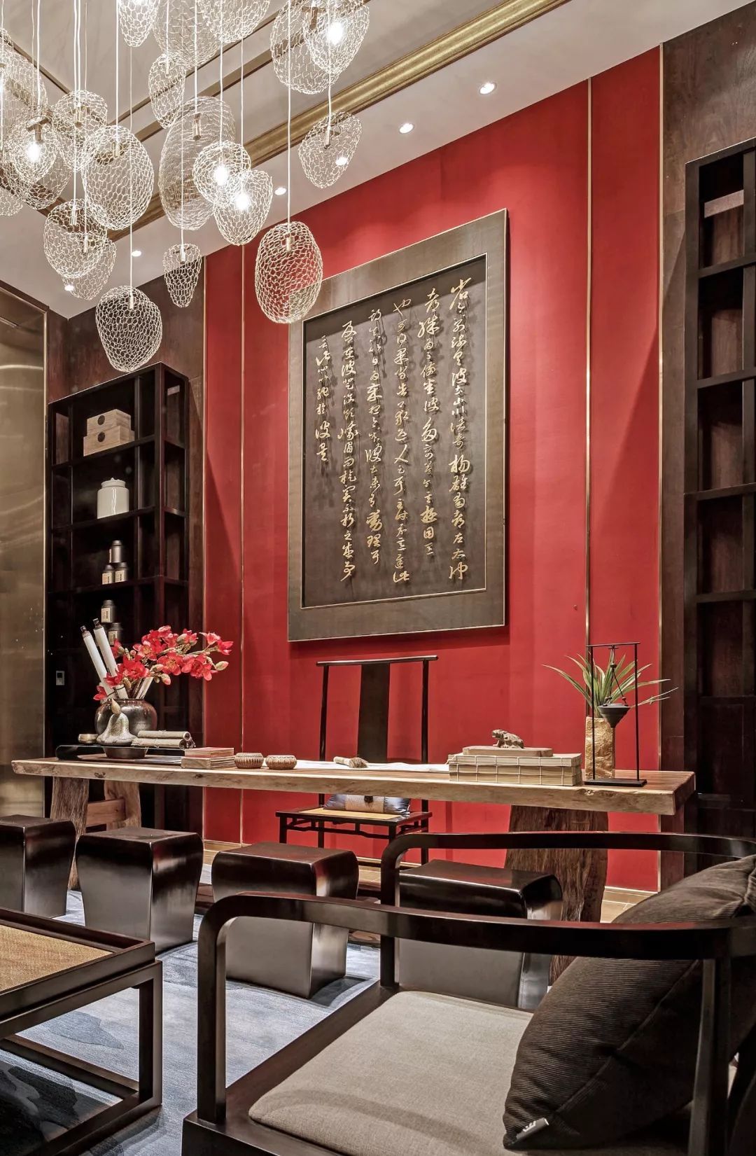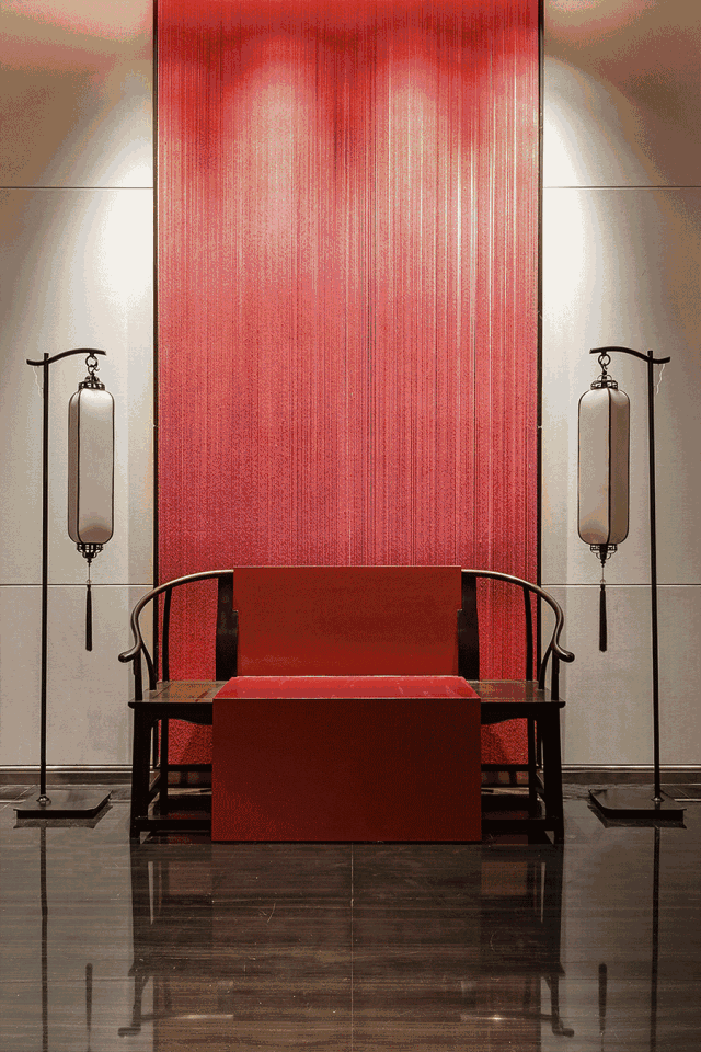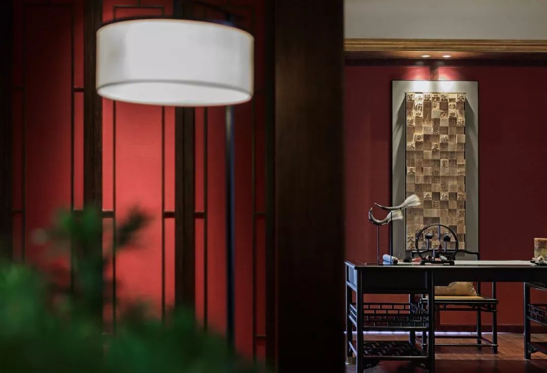 琉璃燈具上流動(dòng)的光影如粼粼水紋,蕩漾在天花,又折落到柔軟的地毯上,四方周正的空間中流淌著靈趣。遵循著古代禮制的家具成序擺放,古沉的灰調(diào)與木色上搭配正統(tǒng)的紅色與黛藍(lán),相得益彰,頗有大家風(fēng)范。