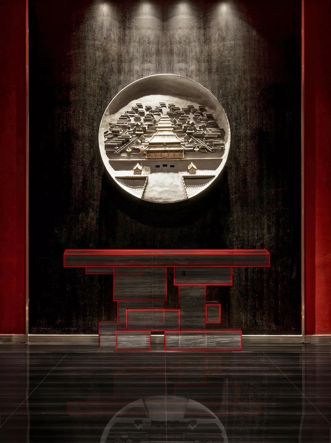 步入室內(nèi),莊重典雅的氣韻流動(dòng)其間。置于紅框勾勒的亞克力裝置上的,是微縮的紫禁城框像,是北地的雄渾與南境的熱情碰撞,是時(shí)間與空間的延續(xù)與展開,引人走進(jìn)對(duì)生命、對(duì)傳統(tǒng)更深的冥想里。