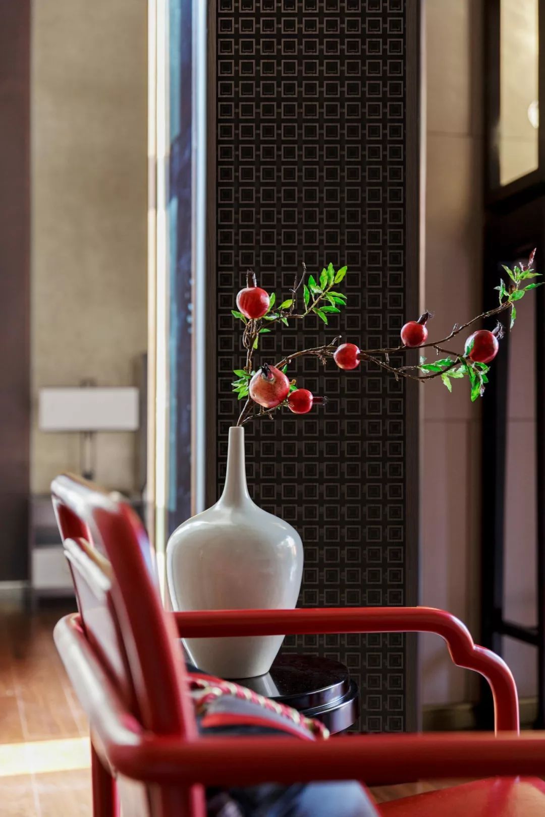 過廳,一抹明妍的鮮紅映入眼眸。絨線穿落其間的壁掛前,一張宋時(shí)簡椅,兩盞明式紙燈,朱紅與縞白互映,在細(xì)語交流中,空間更增添幾分東方古韻。