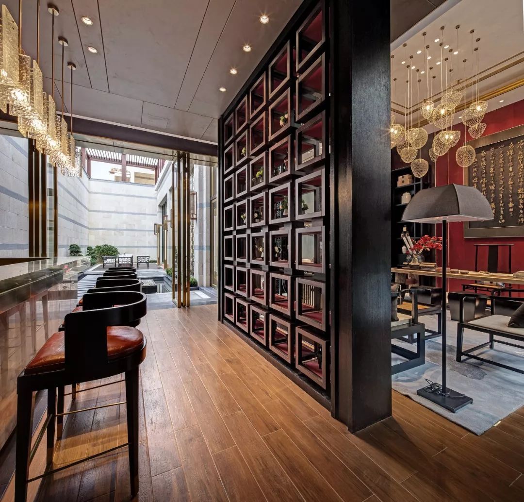 在王府合院,建筑雄健的水平線,昂揚(yáng)的氣度,落在均衡穩(wěn)重的結(jié)構(gòu)上,是端正的方與曲動(dòng)的圓的綜合。室內(nèi)設(shè)計(jì)延續(xù)建筑的形制,在衍脈傳統(tǒng)中式的基礎(chǔ)之上,在方正規(guī)矩中,把實(shí)用與幻想結(jié)合,把器物與觀念結(jié)合,把造型與美結(jié)合,把動(dòng)與靜結(jié)合,兼容并蓄,以穩(wěn)定的水準(zhǔn),在藝術(shù)世界中調(diào)整萬象,曲動(dòng)飛揚(yáng)中調(diào)和出情感的極致。