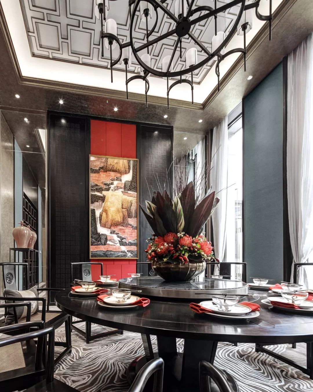 簡潔典雅的玫瑰椅,端正清秀的坐榻,氣質(zhì)雍容的茶幾邊桌,質(zhì)感上乘的柔軟地毯,賦予空間古雅、質(zhì)樸又不失現(xiàn)代的美感;其古樸的造型與正統(tǒng)的設(shè)色,成雙陳設(shè)的器物裝飾,流麗軒昂的水晶吊燈,共同造就空間的秩序感與對(duì)稱性,儼然大氣。