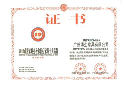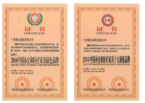 廣州博生家具有限公司,醫(yī)院家具行業(yè)領(lǐng)航者,以過硬的產(chǎn)品質(zhì)量和人性化的專業(yè)服務(wù)獲得了業(yè)內(nèi)的一致好評,并獲得中國企業(yè)發(fā)展促進(jìn)委員會與中國優(yōu)質(zhì)品牌統(tǒng)計中心頒發(fā)的2016政府采購辦公和醫(yī)療家具十大品牌。
