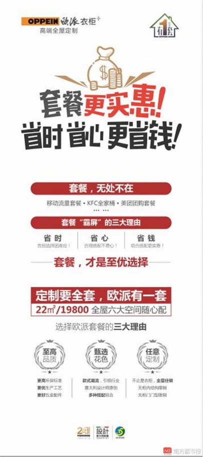 歐派2015年首創(chuàng)推出”19800全屋套餐“,不僅幫助歐派衣柜實現(xiàn)了快速增長,而且在定制家居市場掀起了“全屋套餐”熱。2018年3·15前夕,歐派啟動了春裝節(jié)。此次春裝節(jié)最大的亮點是推出了“全屋22㎡19800套餐”,即僅需19800元,即可定制全屋(客廳、餐廳、臥室、陽臺、多功能房、入戶)22㎡投影面積的家具,例如電視柜、酒柜、衣柜、衣帽間、書柜、書桌、玄關(guān)柜、鞋柜、陽臺柜等。