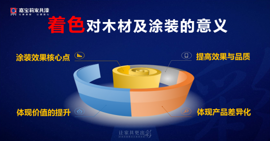 通過(guò)洞察與解決客戶需求,嘉寶莉家具漆隆重推出最新研發(fā)的高性能著色劑,其“凈、透、穩(wěn)、活、快、省”等6大特性能高效解決了著色涂裝難題,不僅省工、省時(shí)、省料,滲透性好,更使木材顏色均勻、色彩鮮活。