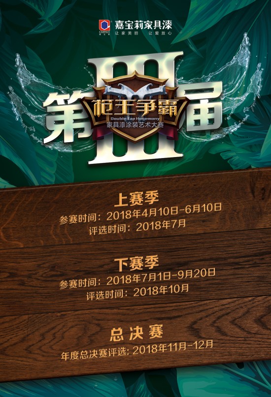 2018年4月10日起,作為國內(nèi)知名涂料及涂裝方案提供商的嘉寶莉,攜第三屆嘉寶莉家具漆“槍王爭霸”涂裝藝術(shù)大賽再度來襲,本次大賽以時下熱度最高的“綠色涂裝”為主題,將家具界與涂料界的目光聚焦在涂裝技術(shù)上,誓要在UV及水性涂裝領(lǐng)域打造絕對的王者,引領(lǐng)新的涂裝潮流!