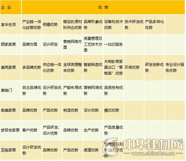 企業(yè)的核心競爭力不外乎品牌、產(chǎn)品、生產(chǎn)制造、設(shè)計研發(fā)、環(huán)保等幾個方面。雖然具體優(yōu)勢表現(xiàn)不盡相同,但大方向是一致,如環(huán)保方面都通過質(zhì)量管理體系認(rèn)證,設(shè)計研發(fā)上都重視原創(chuàng)設(shè)計,擁有眾多自主知識產(chǎn)權(quán)的專利技術(shù)等。