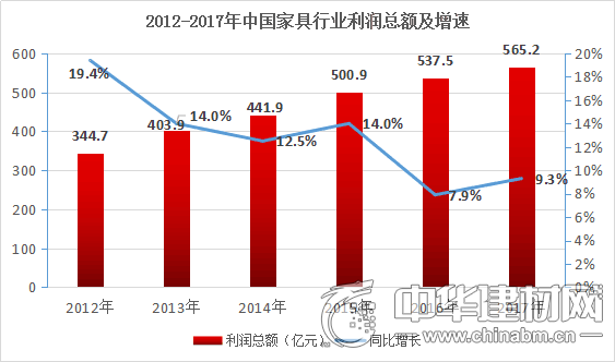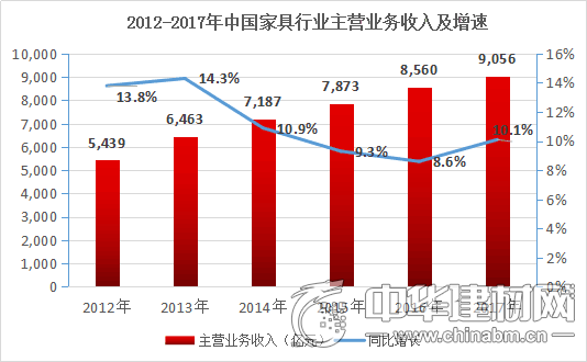 2017年,家具行業(yè)整體發(fā)展趨于平穩(wěn)中略有回升。根據(jù)國家統(tǒng)計局的統(tǒng)計,我國家具行業(yè)規(guī)模以上企業(yè)在2017年實現(xiàn)主營業(yè)務(wù)收入9056億元,同比增長10.1%;實現(xiàn)利潤總額達到565.2億元,同比增長9.3%。截止2017年底,我國家具行業(yè)規(guī)模以上企業(yè)達到6000家,與上年相比增加439家,主要集中在廣東、浙江、福建等地,形成以珠三角、長三角、環(huán)渤海、西部和東北為主的五大家具制造業(yè)產(chǎn)區(qū)。