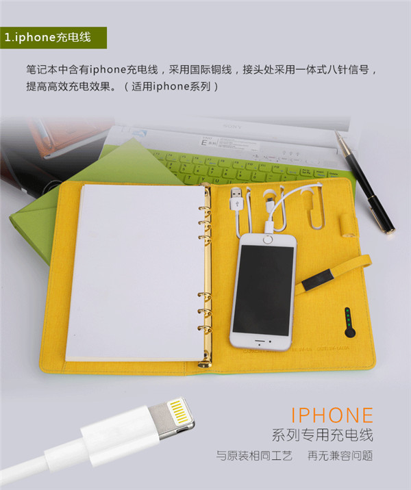 現(xiàn)代人的生活離不開電子產(chǎn)品,但是工作的繁忙讓人無暇充電。深圳市普萊奧實業(yè)有限公司貼心設(shè)計充電記事本,配備金屬磁搭扣,內(nèi)置移動電源,支持蘋果安卓手機一線兩充,更有4個卡槽和一個文件袋設(shè)計,配備80張活頁特級道林書寫紙芯,滿足工作需要,再也不必?fù)?dān)心錯過重要消息。如此實用的禮物,男女皆宜,你不考慮一下嗎?