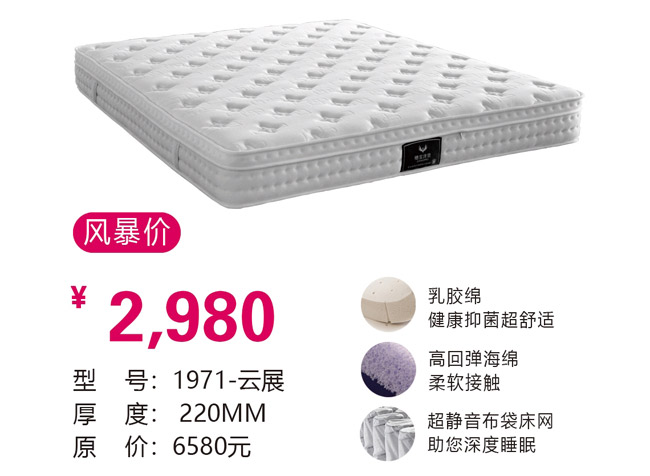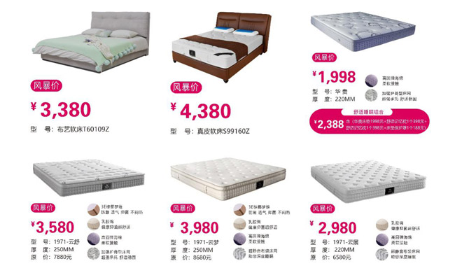 超強承托加強護脊床墊(1.8*2.0)風暴價1998元,超靜音布袋簧床墊(1.8*2.0)2980元,高檔真皮軟床風暴價4380元,時尚布藝軟床風暴價3380元,除此之外,還有更多超值產(chǎn)品供您選購,具體活動詳情可咨詢當?shù)厮雽毚矇|專賣店。