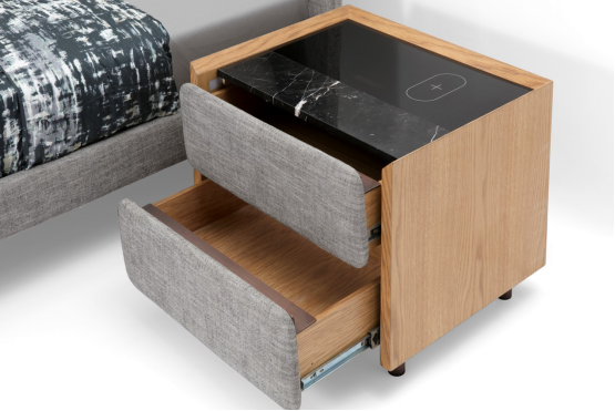 床頭柜具備無線充電和鬧鐘設(shè)置功能,很好地起到配套作用。