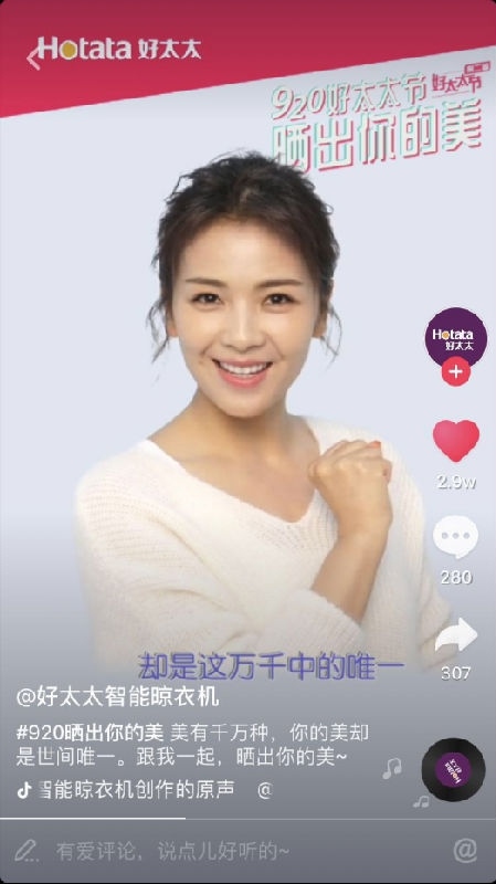 在第二屆920好太太節(jié)來臨之際,廣東好太太集團(tuán)發(fā)起“第二屆好太太節(jié)——曬出你的美”系列主題活動(dòng),在抖音發(fā)起“曬出你的美”挑戰(zhàn)賽,代言人劉濤率先號(hào)召,呼吁太太們站起來,自信曬美,引爆全城曬美秀恩愛熱潮,一眾網(wǎng)絡(luò)紅人爭(zhēng)相表白家中好太太,給太太玩驚喜,為太太做家務(wù),幫太太扮靚……一時(shí)間為太太做一件暖心事,成為了讓每個(gè)丈夫值得驕傲的事。