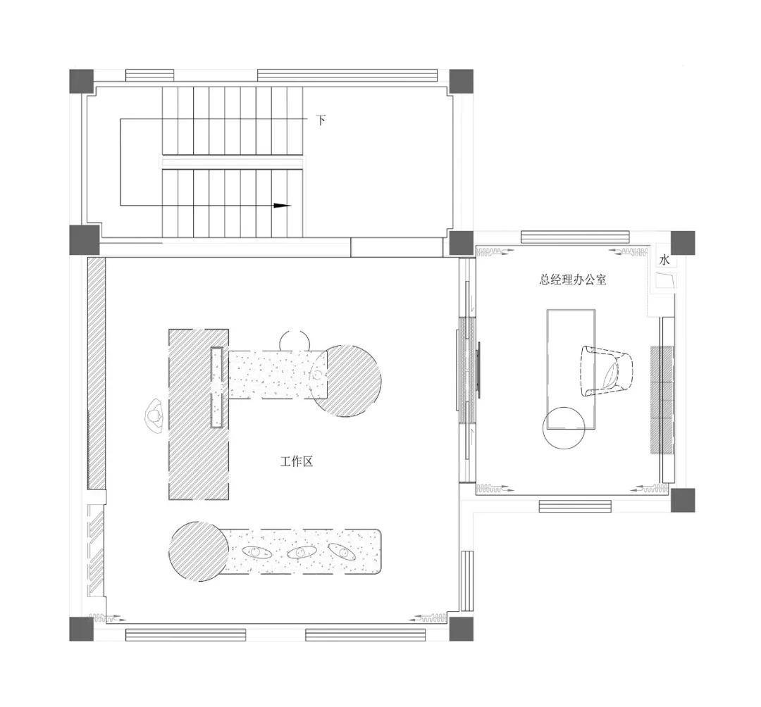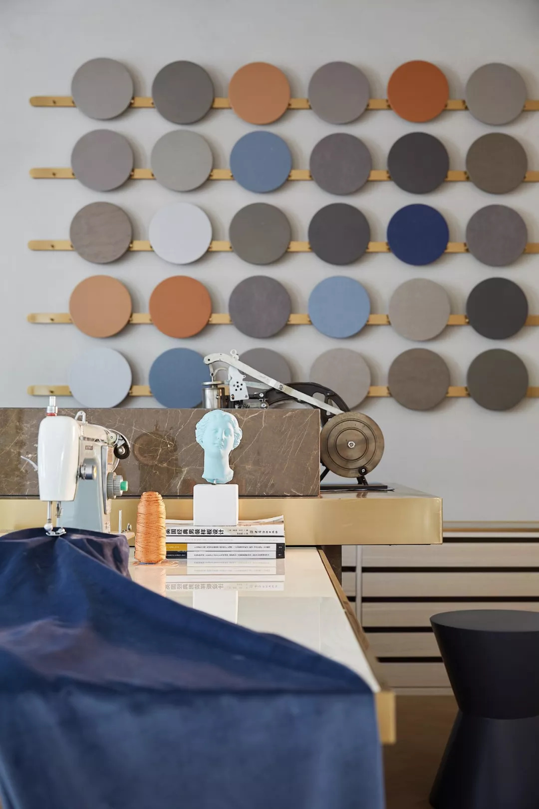 工作室的室內(nèi)設(shè)計由集艾設(shè)計擔綱,合作過程中緊密溝通,并且,則靈藝術(shù)將室內(nèi)的設(shè)計元素沿用到軟裝設(shè)計上,力求從設(shè)計語言上保持一致,實現(xiàn)軟硬裝融合。
