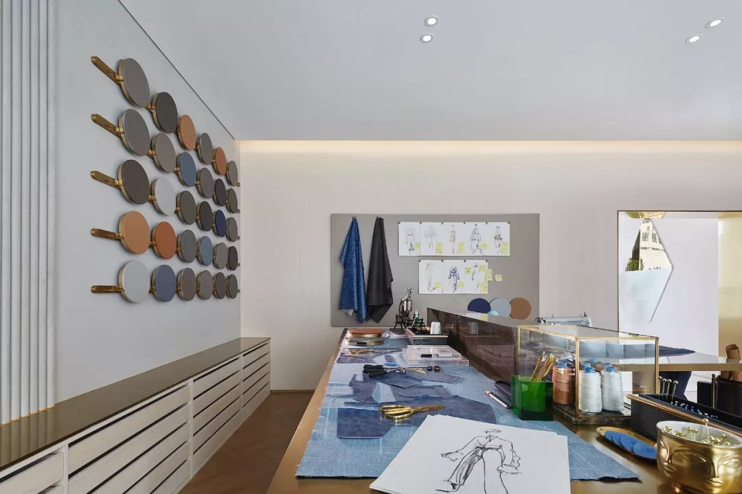3F主要陳設(shè)了Fern Wu的工作流水臺——從小樣、色板、材質(zhì)展示到毛料裁縫臺一應俱全——稀有、歷史感和手工定制是該空間的標志。