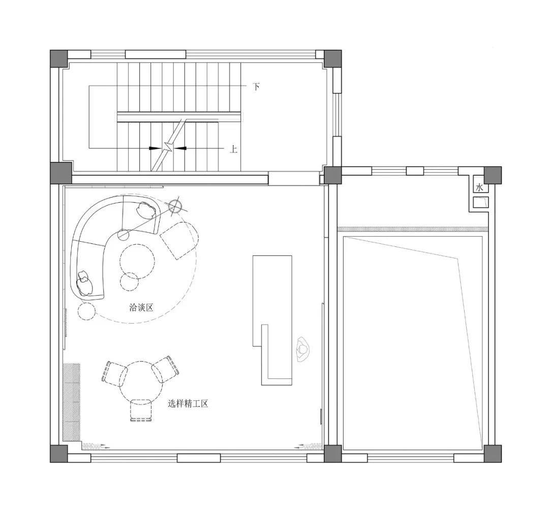 工作室1F設(shè)定為招待展示區(qū),可以在此處對這家工作室的產(chǎn)品有個基礎(chǔ)了解;2F供深度洽談以及選樣;3F則是設(shè)計師們的工作區(qū)域;為工作室的重要客人和朋友,規(guī)劃了夾層空間,可以進行私密高級的聚會,同時此處還承擔舉行發(fā)布會的功能。