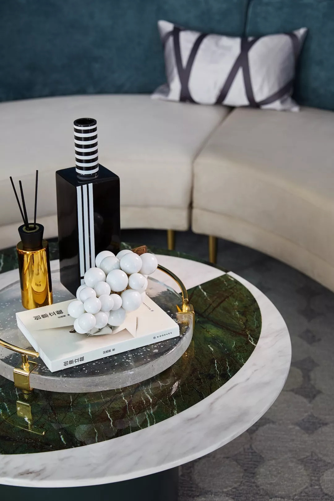 2F相對私密的洽談空間,家具同樣以自然幾何形態(tài)置入,圓形的茶幾、流線型的沙發(fā)、發(fā)光藝術(shù)裝置掛畫,讓空間既高雅又舒適。