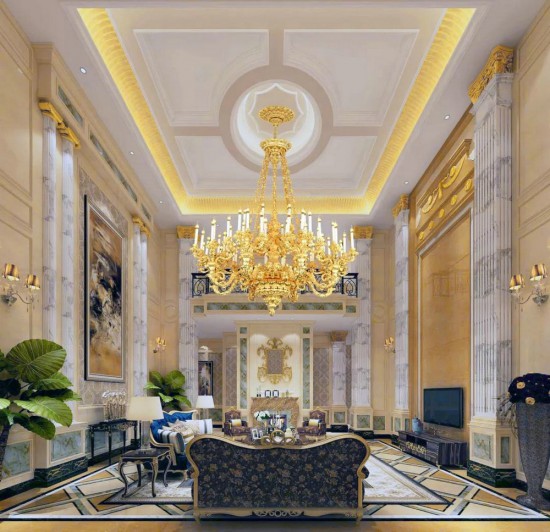 以華麗的裝飾、濃烈的色彩、精美的造型達到雍容華貴的裝飾效果。在歐式建筑照明設(shè)計中客廳頂部喜用大型燈池,并用華麗的枝形吊燈營造氣氛。