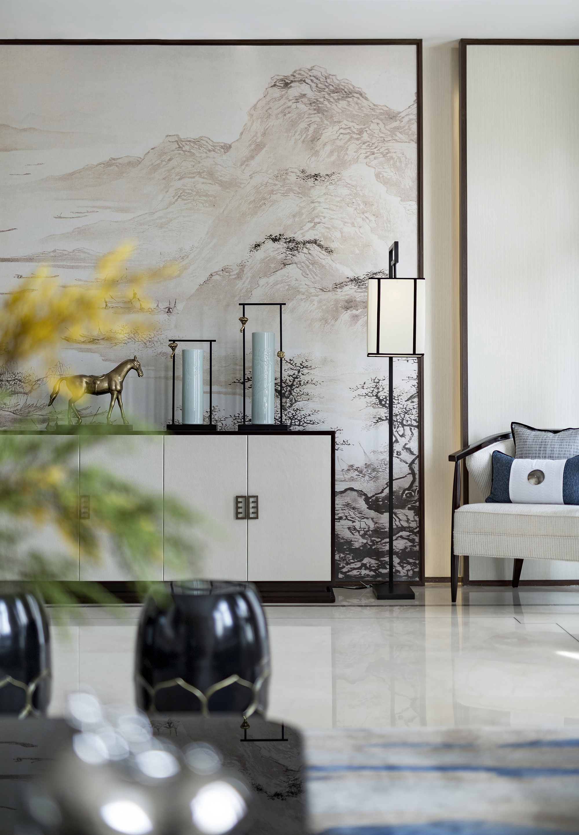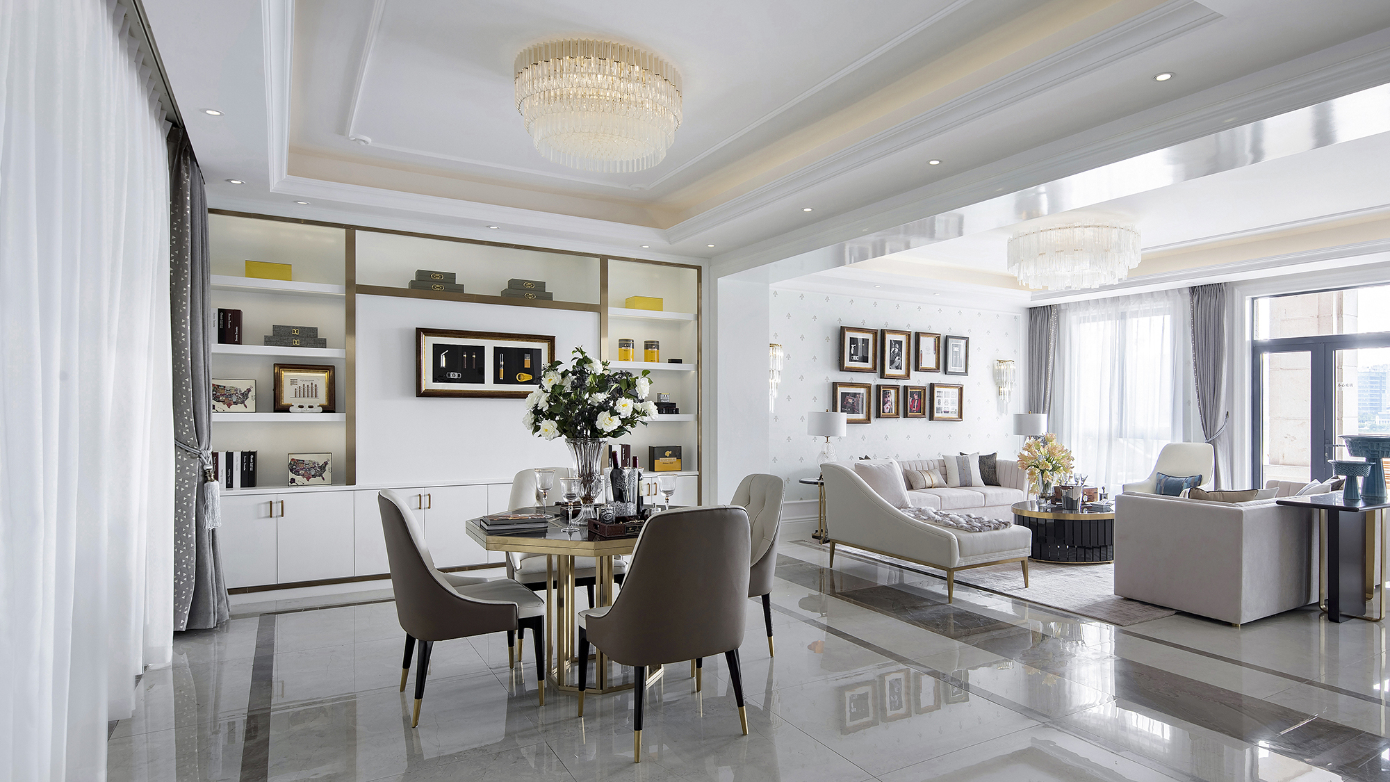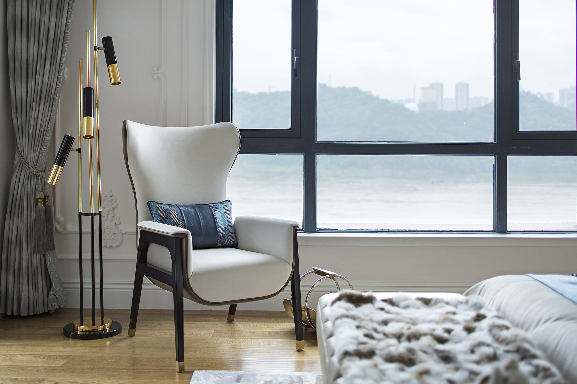會客廳在純白的主基調(diào)上,用灰色威尼斯漆的歲月肌理與香檳金進行調(diào)和、碰撞,清麗的設(shè)色搭配著典雅的陳設(shè)藝術(shù)品、品質(zhì)承襲的舒適家具,彌漫出一室輕盈雅致的古典風韻。戶外庭院的美景透過潔白的窗幔若隱若現(xiàn),在安謐的氛圍中打破空間與自然的界限,細品山城的人文與浪漫。