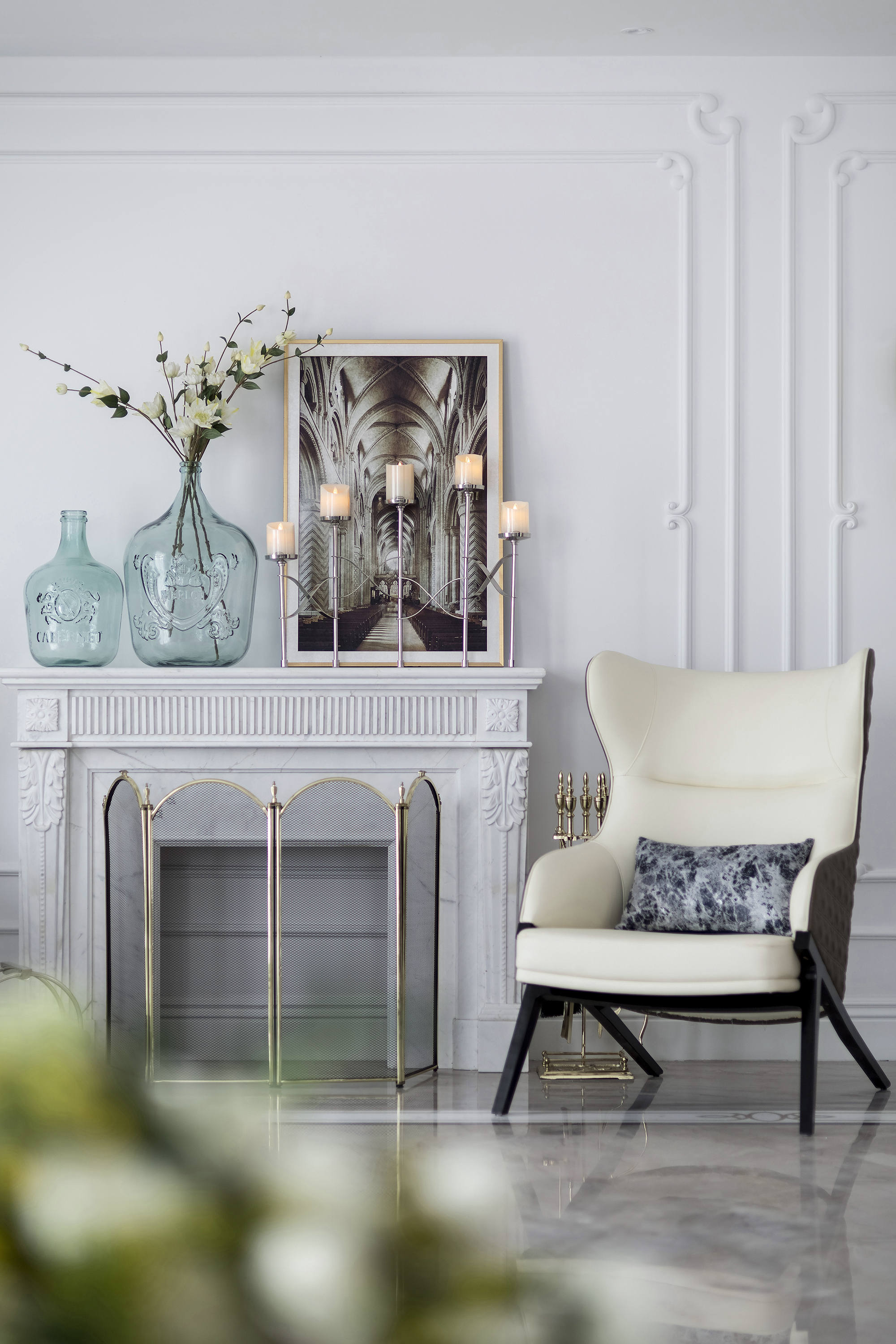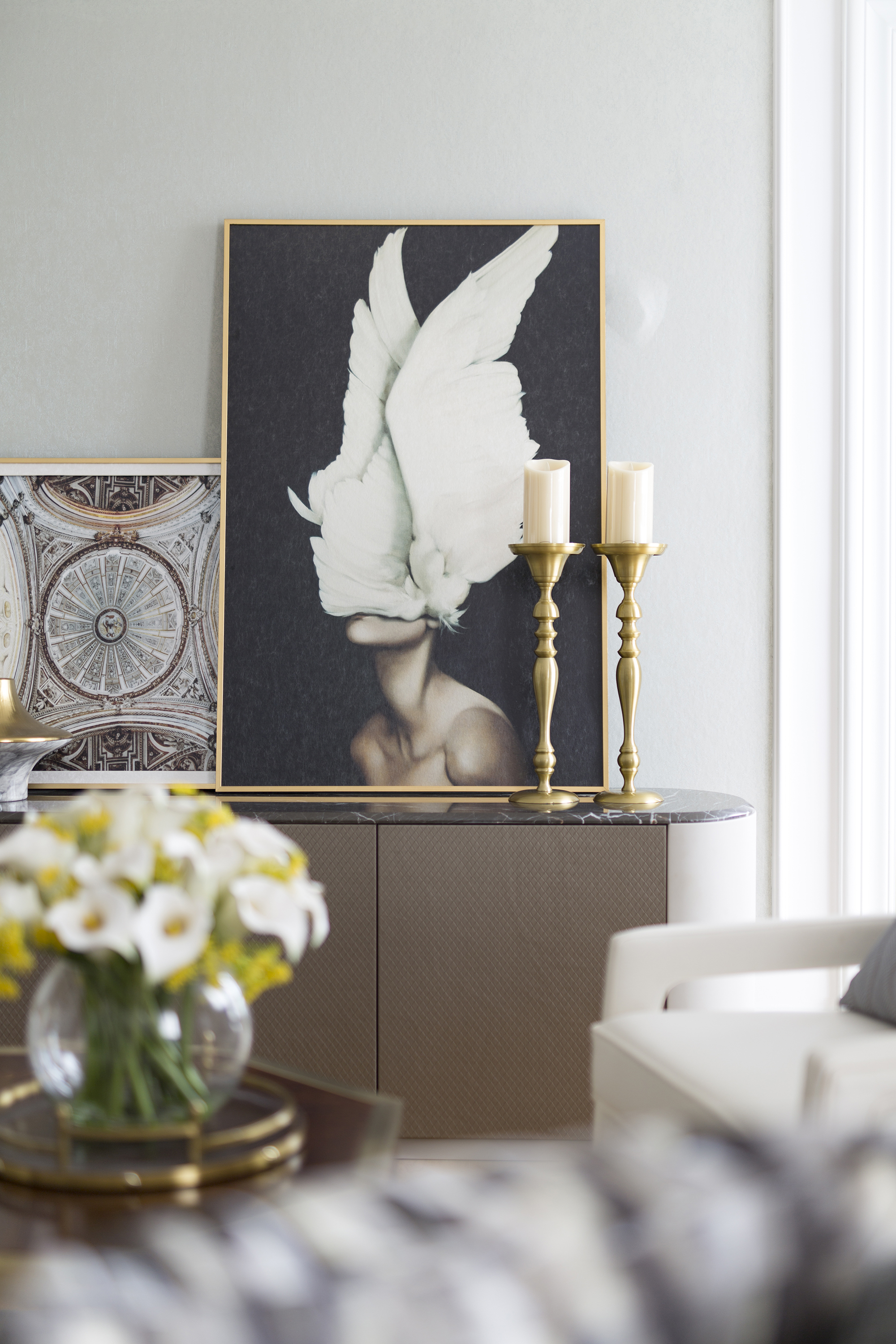 客廳除卻法式美學特有的儀式感之外,純凈的山茶花撥動著空間的情緒,芬芳而素樸的沁香流于一室,建立起空間與人的情感鏈接。細節(jié)處的雕花、廊柱、線條,勾勒出古典美的精致和浪漫,而卷草紋,羅馬柱等法式經(jīng)典元素則以更加精煉的語言散發(fā)出嫵媚優(yōu)雅的情思。