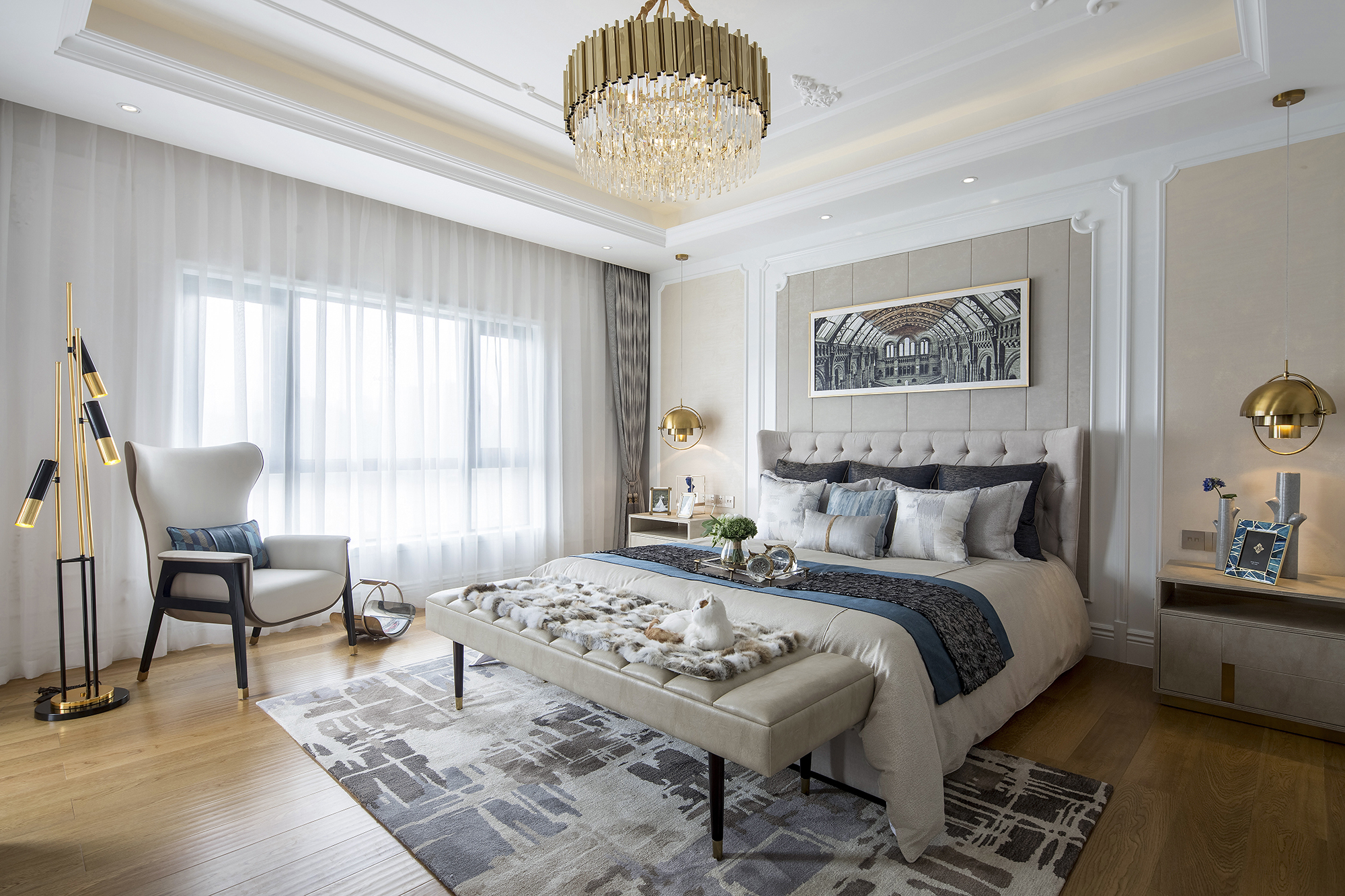 臥室散發(fā)著濃郁的法式情韻,醇美的軟飾和色彩,質(zhì)樸的淺棕柔雅而安謐,凝結(jié)著高端而沉穩(wěn)的品位和質(zhì)感。幾何語言的紛繁典雅,搭配金色家具框架的流麗、水晶擺件的剔透雅致,讓空間的魅力在無言中綻放升級,兼容細膩的柔美與輕奢的風華。