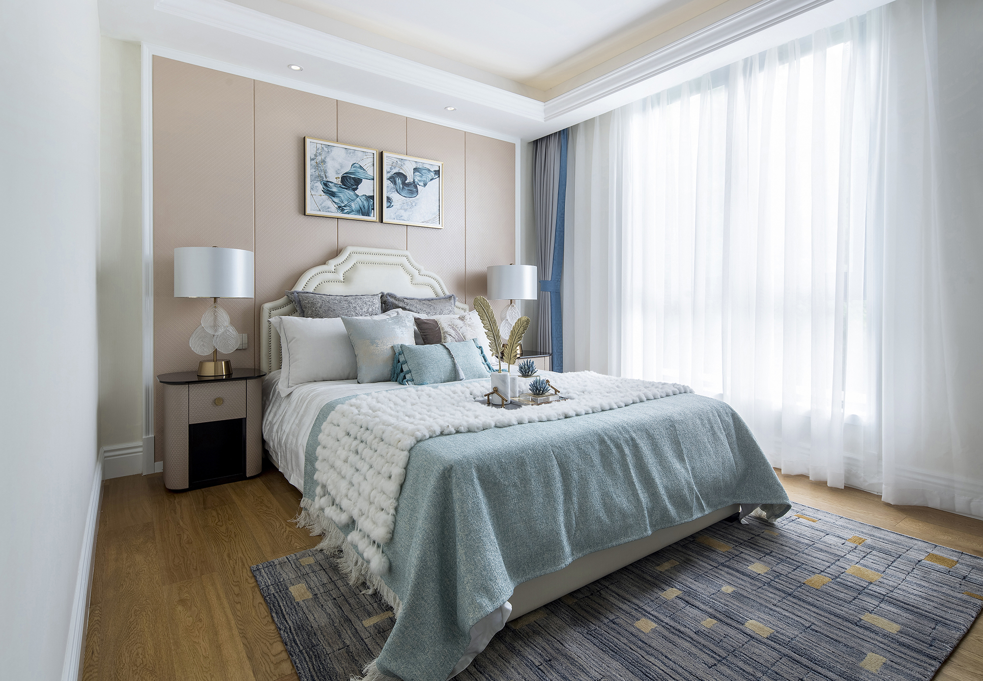 設(shè)計以中性低調(diào)的設(shè)色搭配絲綢皮包的細膩質(zhì)感,極致的簡白做底,幽藍的床品綴于其中,以品質(zhì)感凸顯出空間高貴而雅澹的氣質(zhì)。