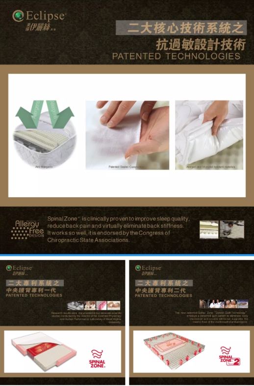 在全球市場上專門為“護(hù)脊”而設(shè)計(jì)的床墊品牌,最早的就是來自美國的Eclipse伊麗絲床墊,在1967年發(fā)明的被稱為“床中床”的“中央護(hù)背”設(shè)計(jì),可以減輕腰部、背部及脊椎的壓力,保持人體的曲線美,能有效提高29%的睡眠質(zhì)量,提高34%減輕背部疼痛功能,提高96%背部疾病預(yù)防功能,被世界公認(rèn)為護(hù)脊床墊領(lǐng)域的專家,也是全球唯一一家獲得美國國家脊椎治療協(xié)會(huì)認(rèn)證的床墊品牌。