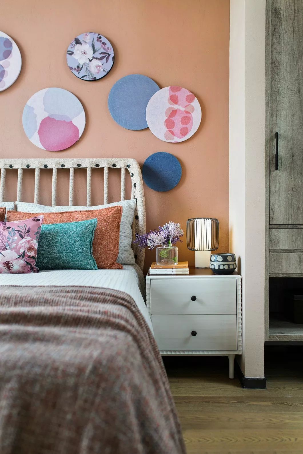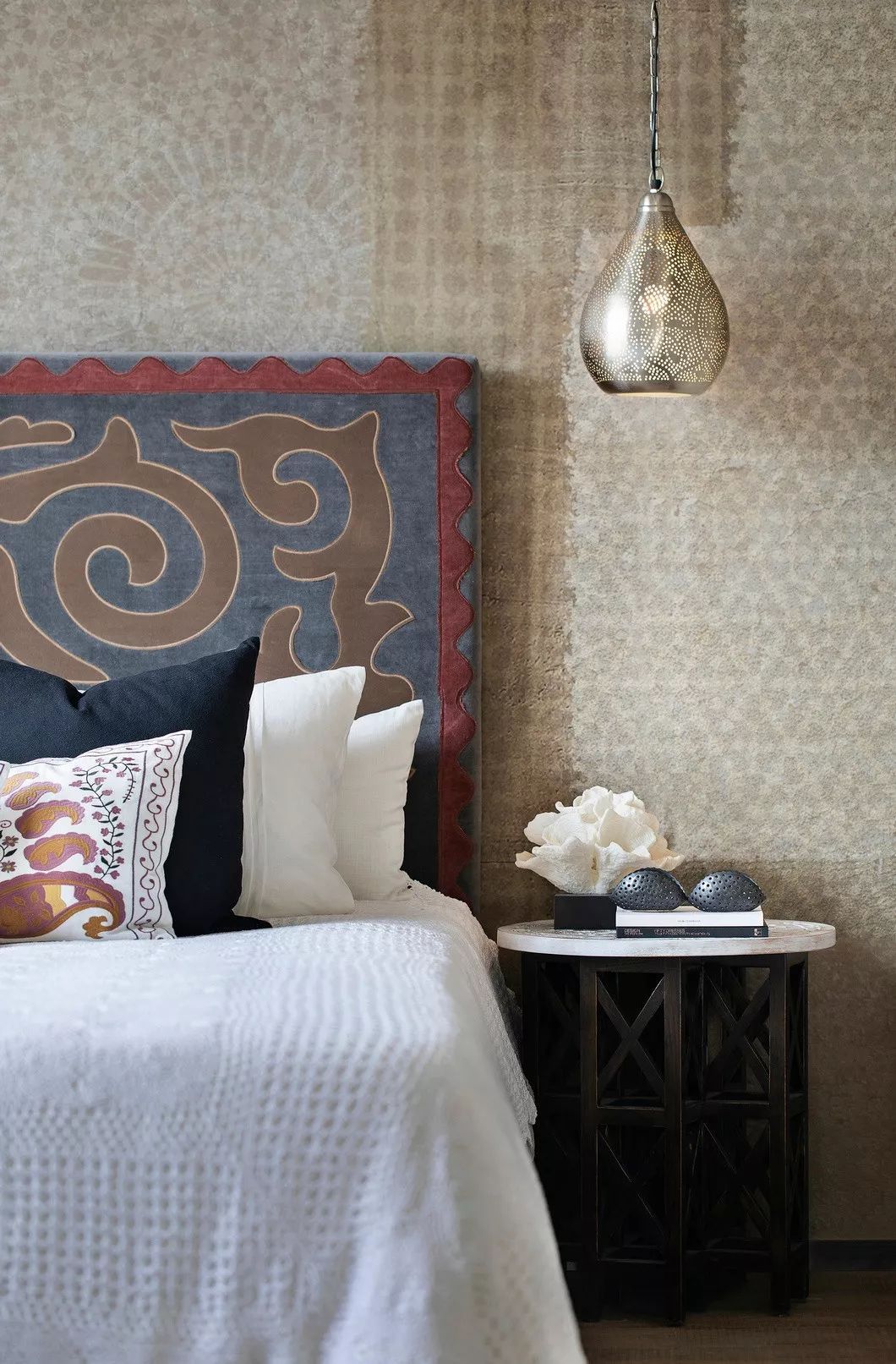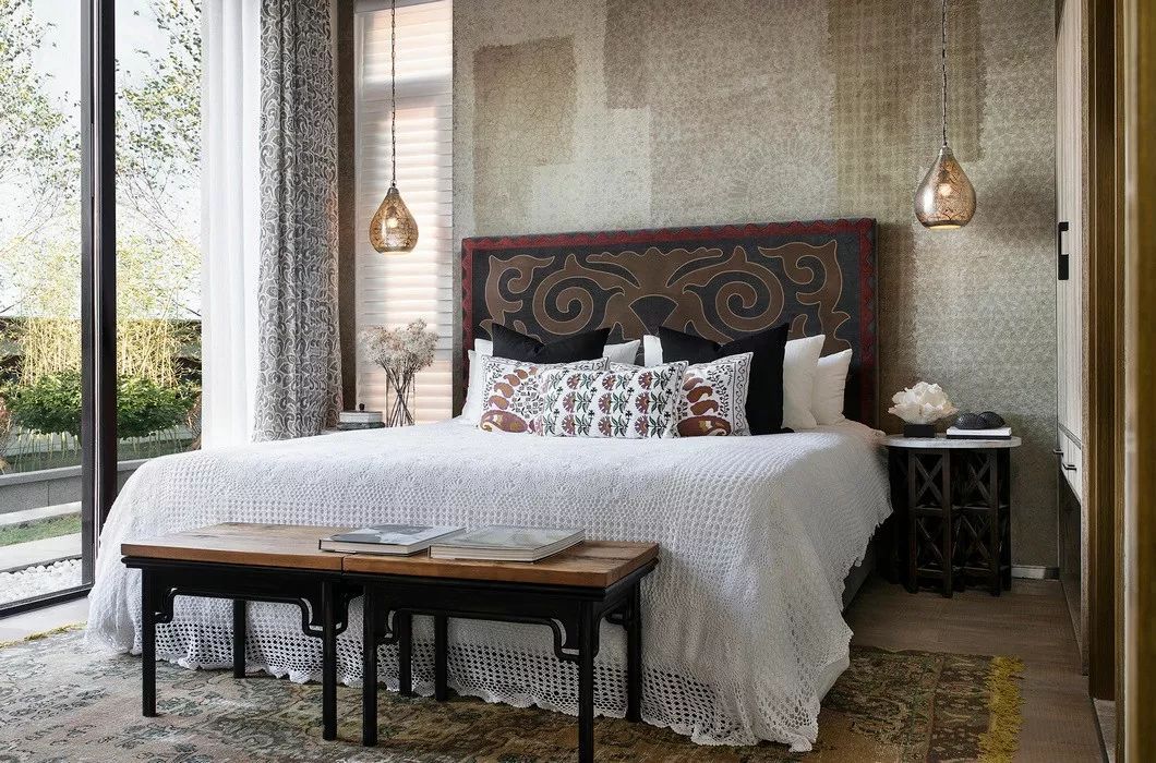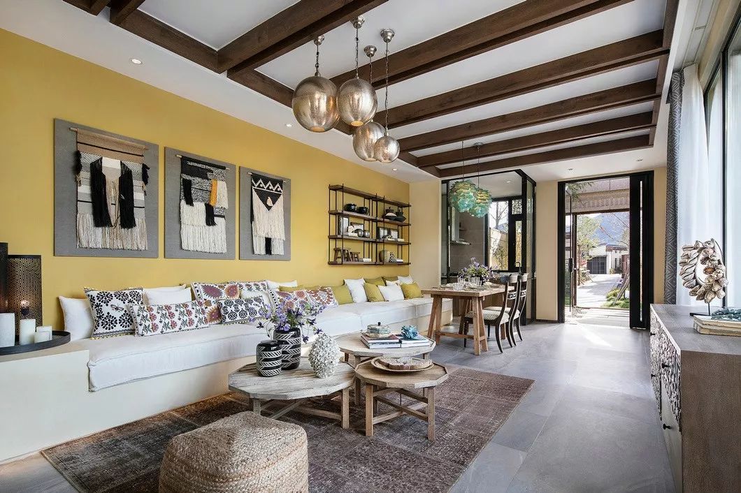 設(shè)計(jì)師通過(guò)北非設(shè)計(jì)元素如毛線編織成的掛畫飾品、紋樣新穎的花樽、民族風(fēng)情印花抱枕等,點(diǎn)染出空間異域夢(mèng)幻的光彩,同時(shí)因浸潤(rùn)著原木材質(zhì)的清氣,予人安心舒適體驗(yàn)。