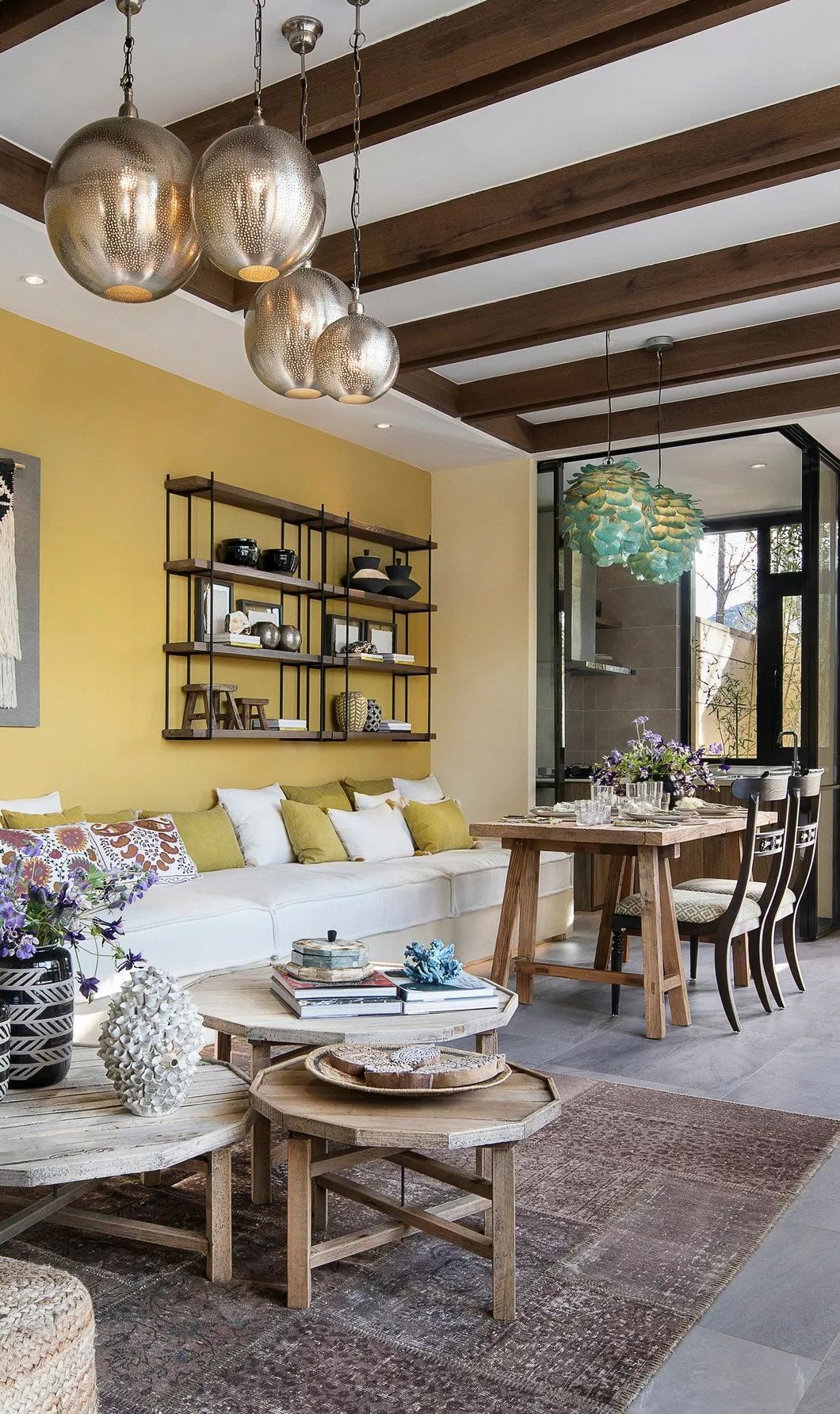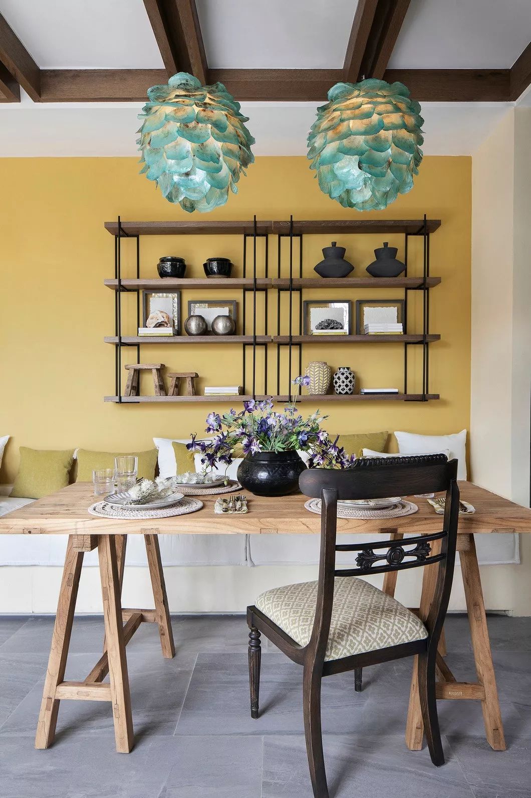 用餐區(qū)位于客廳一隅,窗外便是幾株青翠修竹,棕色原木桌上擺放著沉靜清恬的紫花,黑色的組合圓形圖案,讓空間的表現(xiàn)力更顯豐盈。