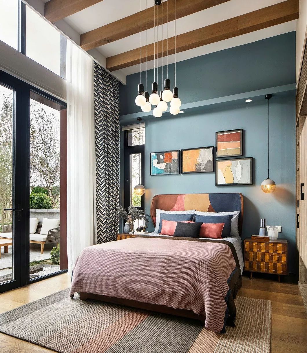 在臥室空間的處理中,布魯盟設(shè)計(jì)融入了更多的當(dāng)代筆觸。抽象水粉裝飾畫,通過(guò)色彩的調(diào)和來(lái)營(yíng)造空間的夢(mèng)幻田園氣息。