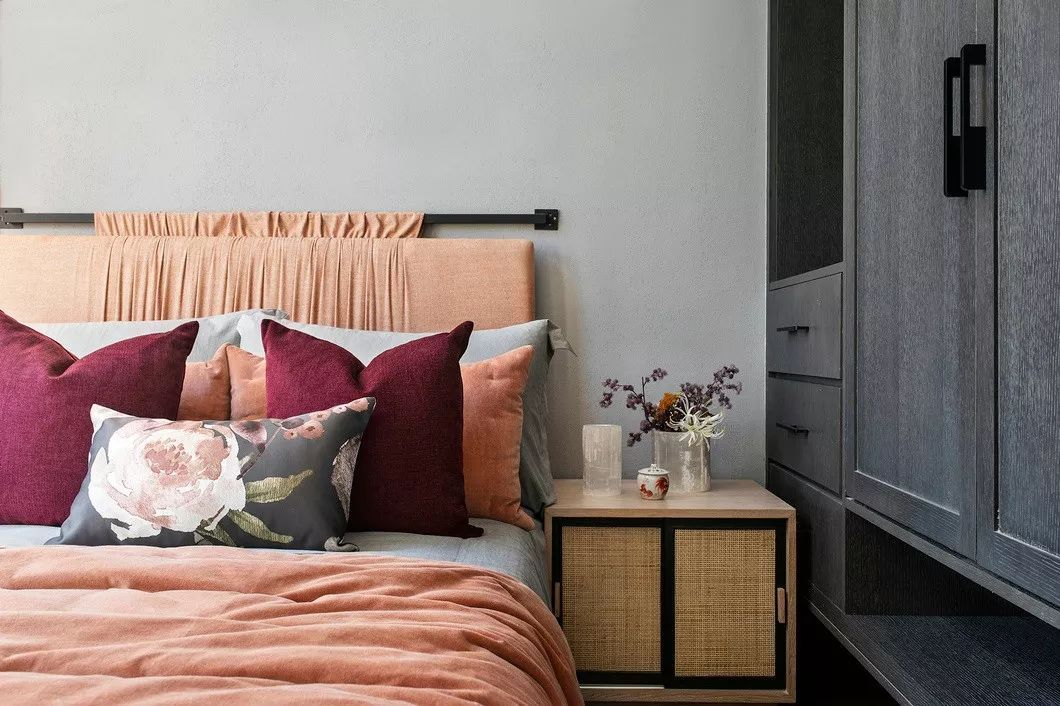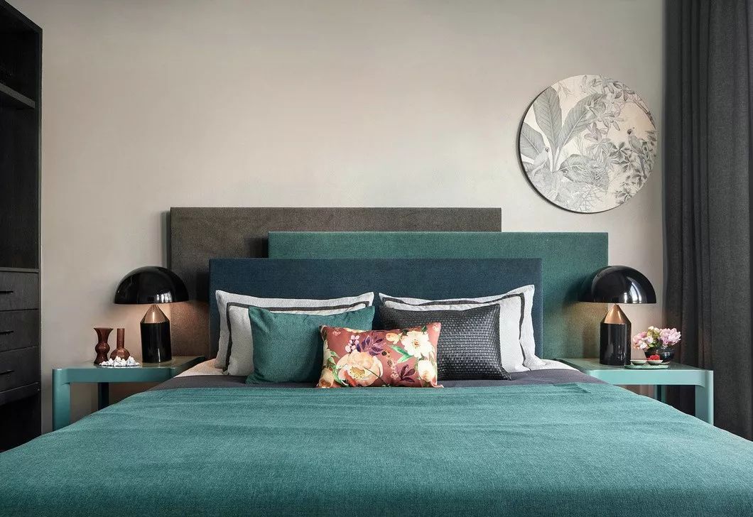 設(shè)計(jì)在清涼與溫?zé)帷⒊林c明艷之間尋覓到微妙的平衡,汲取于自然的色彩,亦有著恰到好處的人文溫度。臥室空間設(shè)計(jì)融入了簡(jiǎn)約的幾何色塊,結(jié)合自然靈韻和極具傳統(tǒng)氣質(zhì)的飾物,使空間氛圍顯得悠然而生動(dòng)。