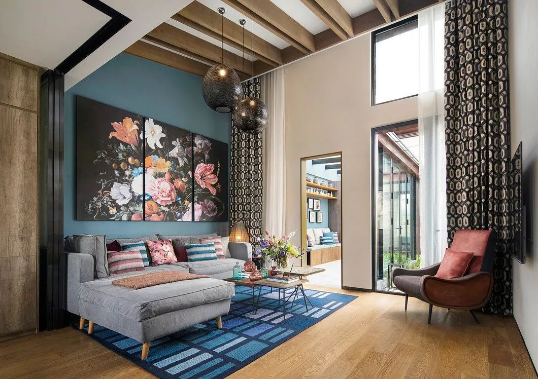客廳借由大面積的植物元素裝飾,散發(fā)出沛然奔放的生命氣息,沉凝的黑襯托繁花的曼妙多姿,藍(lán)色幾何紋樣地毯打破空間的慣常想象,又與沙發(fā)軟飾之間存在自然呼應(yīng)。