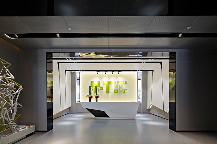 洽談區(qū)的部品選取中國原創(chuàng)家具,其豐富的塊狀組合方式與空間設(shè)計語言有異曲同工之妙。沙發(fā)、地毯、桌幾、飾品等軟裝的酷黑,與硬裝的白色在空間中形成極具現(xiàn)代主義的視覺觀感。干凈的桌面上獨放姿彩的天堂鳥,用向上生長的姿態(tài),禮贊自然的生命力。