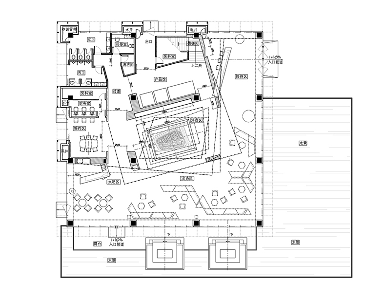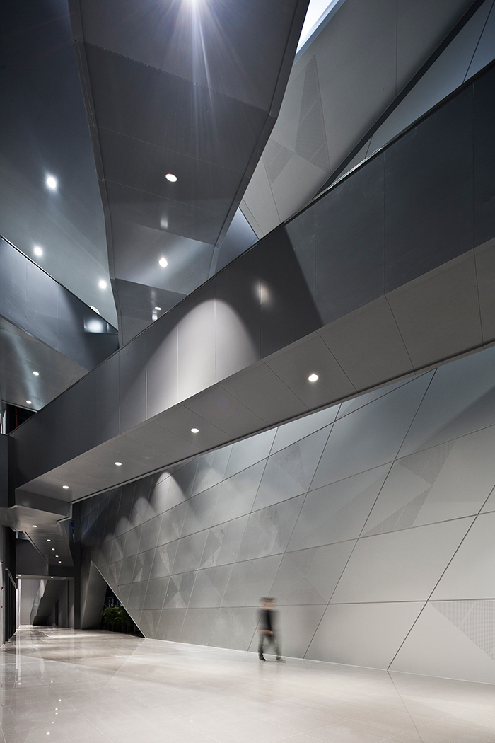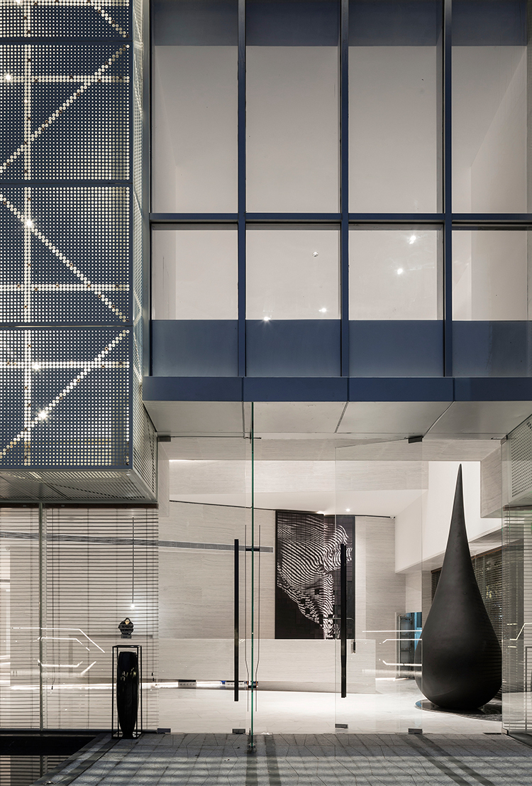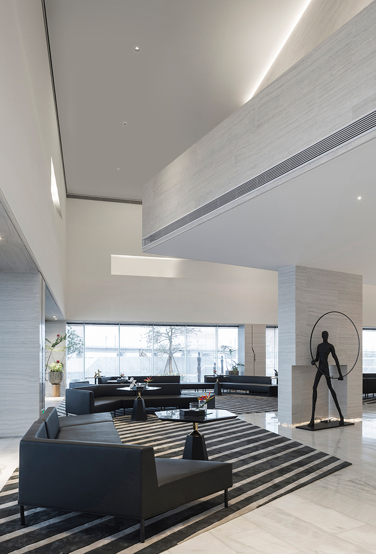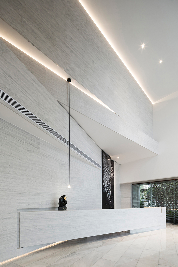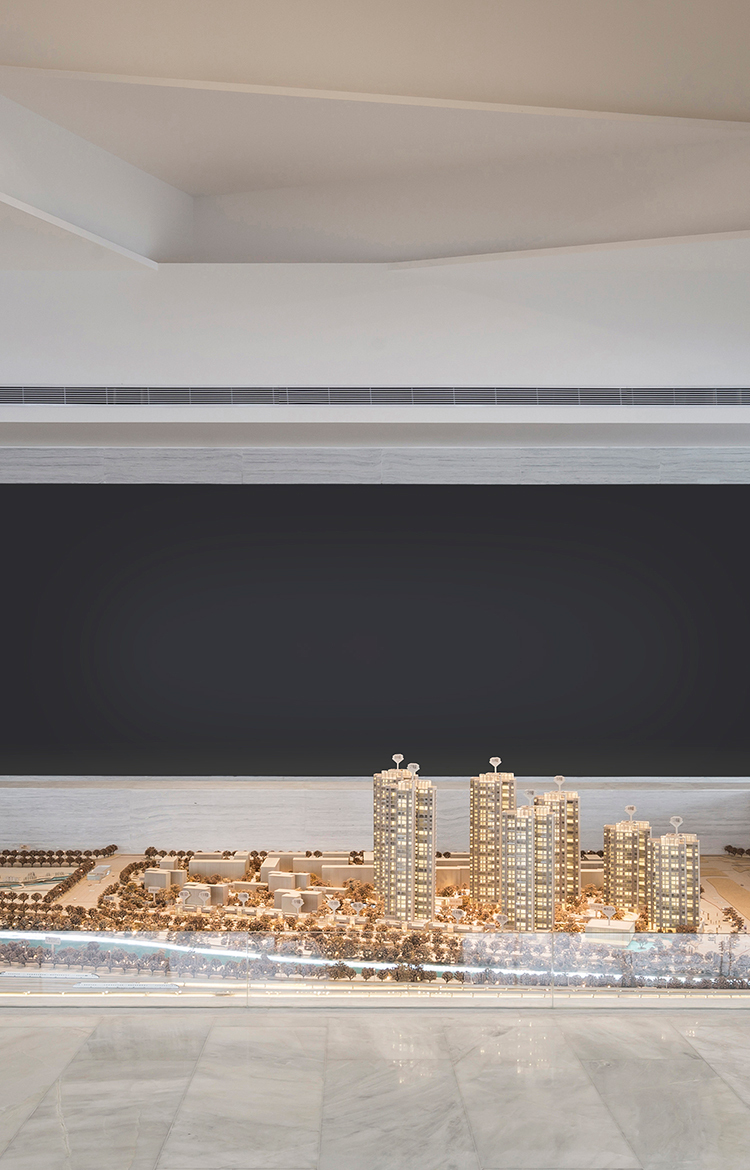 墻面、天花、接待臺、水吧臺、陳列柜、沙盤模型,均以延續(xù)性的塊面元素、創(chuàng)意性而簡約的視覺造型、純粹的現(xiàn)代主義美學(xué)及精尚的質(zhì)感,定制出屬于這個空間的設(shè)計語言。行進空間,建筑體塊的起承轉(zhuǎn)合、層高不一的組合,展演出空間豐富的層次感、轉(zhuǎn)折自然的秩序性。