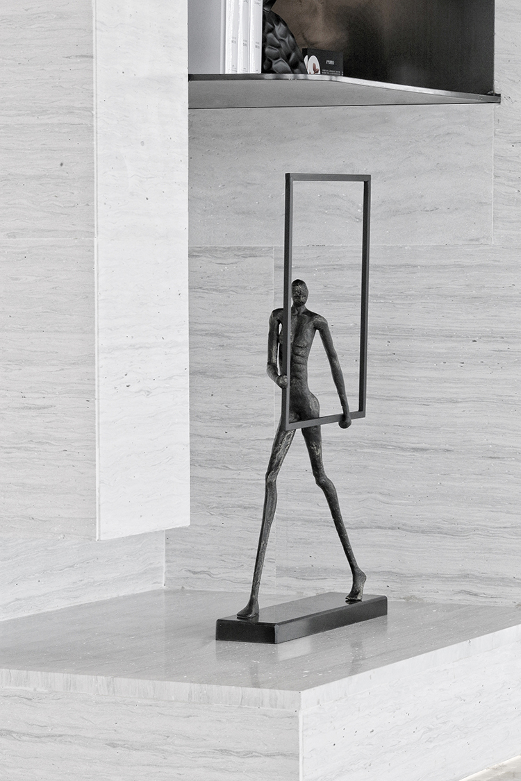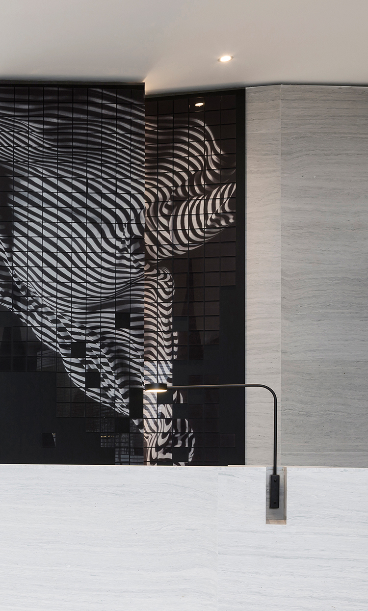 承接硬裝簡單純粹的美學(xué)風(fēng)格,軟裝的形式亦是簡潔大氣的現(xiàn)代風(fēng)格。陶瓷的純凈,石材的紋理,金屬的硬朗,皮革的柔軟,彼此之間形成虛實的對比關(guān)系。燈飾極簡的線條造型構(gòu)造出靜默的觀感,有的內(nèi)嵌于柜臺,有的鏈接在墻面,軟飾與硬裝彼此相生相連,碰撞出大膽而極具活力的藝術(shù)個性。