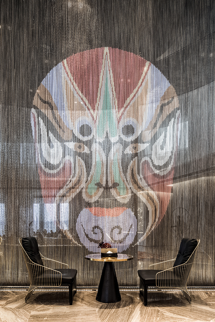 空間中引入大量藝術(shù)裝飾品,將河馬、猩猩、氣球玩偶等具象的形態(tài)抽象化,趣味立顯;而點綴其間的藝術(shù)掛畫又以線條的無限重復(fù)形態(tài)呼應(yīng)空間的幾何語言,將水紋的無形具體化;光影哲學(xué)、視覺藝術(shù)與自由夢幻的思緒融匯于一體,凝練出極具韻律美感的現(xiàn)代藝術(shù)空間。
